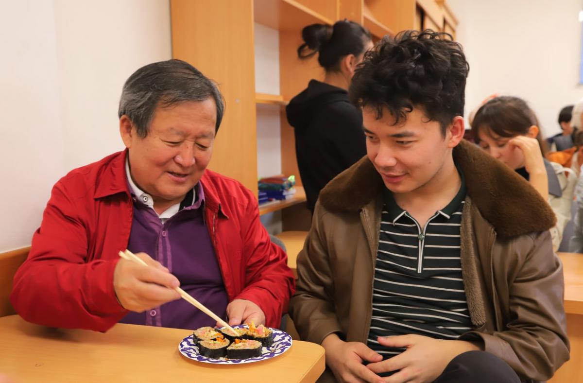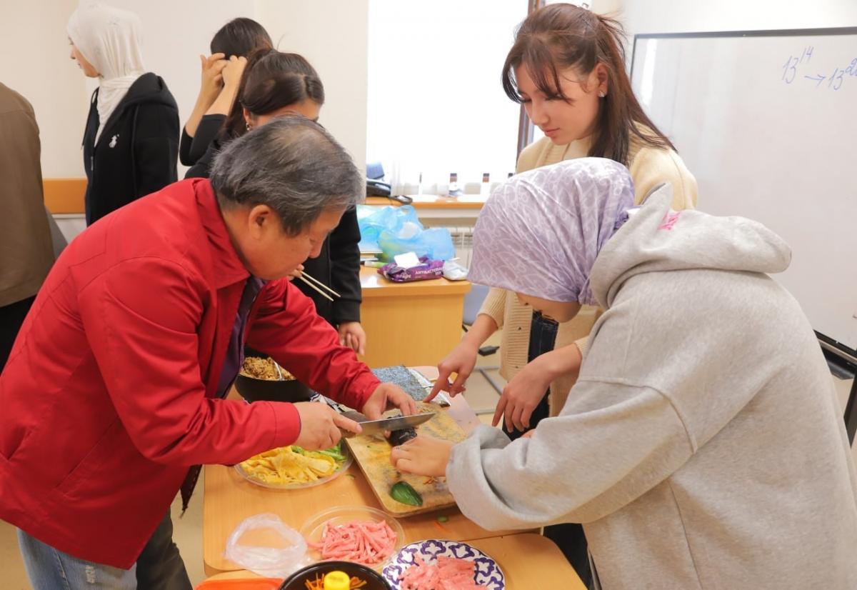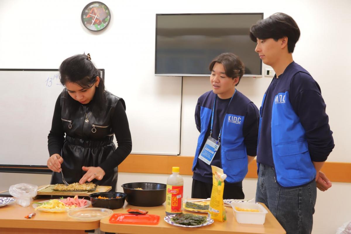 Dars avvalida koreys oshxonasining mashhur taomlaridan biri bo‘lgan 김밥 (kimpap) tayyorlash jarayoni bosqichma-bosqich namoyish etildi. Talabalar jarayonni kuzatish bilan cheklanmay, kichik guruhlarga bo‘linib o‘zlari ham kimpap tayyorlash imkoniga ega bo‘ldilar. Bu amaliy mashg‘ulot ularga nafaqat bilimlarni mustahkamlash, balki tilni amalda qo‘llash va hamkorlik ko‘nikmalarini rivojlantirishga yordam berdi.