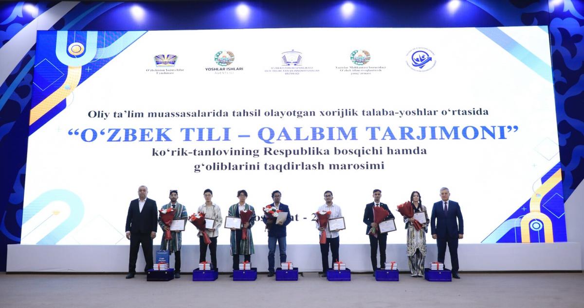 Vazirlar Mahkamasining Davlat tilini rivojlantirish departamenti, Oliy ta’lim, fan va innovatsiyalar vazirligi hamda tegishli mas’ul tashkilotlar hamkorligida o‘tkazilgan “O‘zbek tili – qalbim tarjimoni” respublika ko‘rik-tanlovining yakuniy bosqichida Alisher Navoiy nomidagi Toshkent davlat o‘zbek tili va adabiyoti universiteti talabasi, Shen Xintong (Shanxay chet tillari universitetining 3-bosqich talabasi, akademik almashinuv dasturi doirasida O‘zbek tili va adabiyoti fakultetida tahsil olmoqda) faxrli 1-o‘rinni egalladi. Unga Shanxay chet tillari universitetiga o'zbek tilidan dars berish uchun aynan ToshDO'TAUdan yuborilgan mutaxassislar ona tilimizni o'rgatishgan.