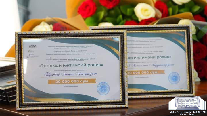 Milliy matbuot markazida Axborot va ommaviy kommunikasiyalar agentligi tashabbusi bilan, Yoshlar ishlari agentligi, Elektron ommaviy axborot vositalari milliy assotsiatsiyasi hamkorligida o‘tkazilgan «Assalom, Navro‘z — yangilanish, mehr-oqibat va qadr-qimmat ayyomi!» tanlovi g‘oliblarini tantanali taqdirlash marosimi bo‘lib o‘tdi. Tadbirda AOKA direktori Asadjon Xodjaev, EOVMA rahbari Sherzodxon Qudratxo‘ja, Yoshlar ishlari agentligi direktori o‘rinbosari Dilnoza Kattaxonova, O‘zbekiston jurnalistlari ijodiy uyushmasi raisi Olimjon O‘sarov, tashkiliy qo‘mita va hakamlar hay'ati a'zolari, jurnalistlar ishtirok etdi. Hakamlar hay'atining xulosalariga ko‘ra, 513 ta ijodiy ish tanlov talablariga javob berishi aniqlandi. Shundan «Eng yaxshi ijtimoiy rolik» nominatsiyasi bo‘yicha 3 ta ishtirokchi; «Eng yaxshi she'r ijrosi» (videomaterial shaklida) 4 ta ishtirokchi; «Eng yaxshi fotosuratlar» nominatsiyasi bo‘yicha 4 ta ishtirokchining materiallari munosib o‘rinlarga loyiq ko‘rildi. G‘oliblarga maxsus sertifikatlar va pul mukofotlari tantanali ravishda topshirildi. Universitetimiz Tarjima nazariyasi va amaliyoti fakulteti talabasi To’xtayev Akmal Alisher o’g’li “Eng yaxshi ijtimoiy rolik” nominatsiyasi bo’yicha 1-o’rinni qo’lga kiritib, maxsus sertifikat hamda 20 mln. so’m pul mukofoti bilan taqdirlandi.