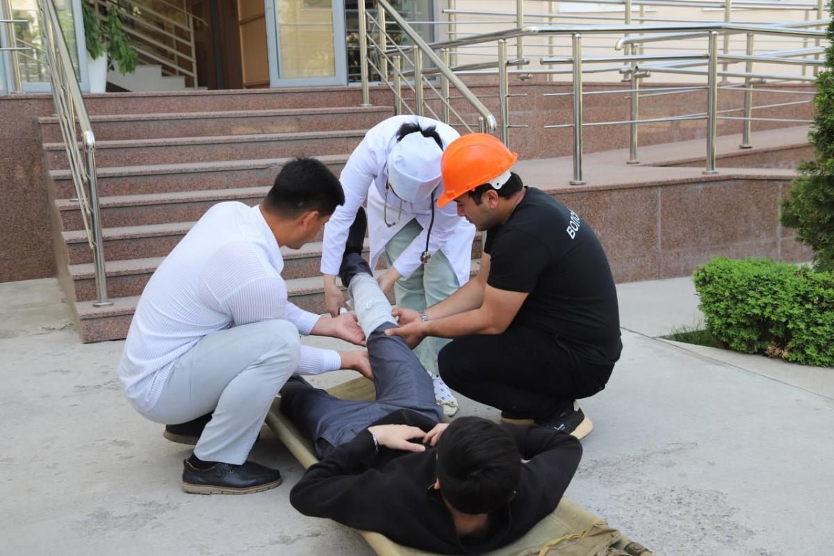 Mashg‘ulotlar davomida favqulodda vaziyat sodir bo‘lganda universitetda tashkil etilgan ko‘ngilli yong‘in o‘chirish va qutqaruv guruhlari tomonidan zilzila yoki yong‘in kabi holatlarda qanday harakat qilish tartiblari amaliy mashqlar orqali ko‘rib chiqildi. Xususan, birinchi tibbiy yordam ko‘rsatish, yong‘in o‘chirish jihozlaridan foydalanish, xavfsizlik choralariga rioya qilish kabi muhim yo‘nalishlar bo‘yicha ishtirokchilarning bilim va ko‘nikmalari yana bir bor mustahkamlandi.