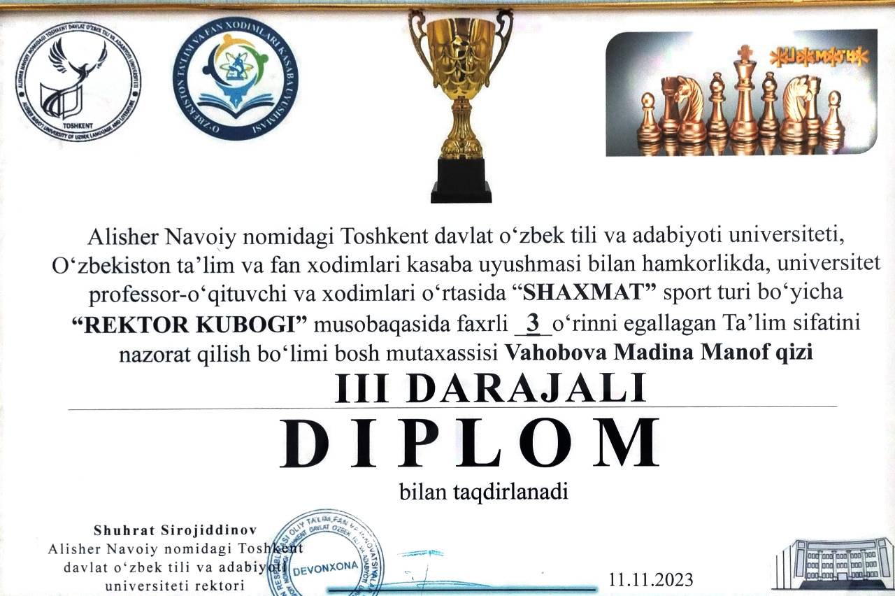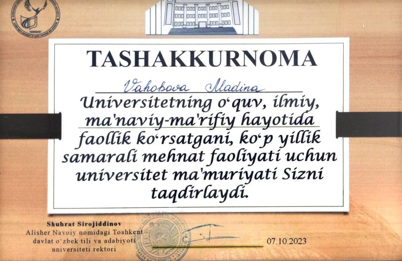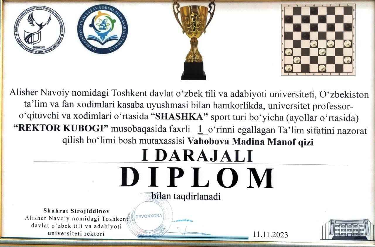 Bosh mutaxassis.Taʼlim sifatini nazorat qilish boʼlimi. Аlisher Navoiy nomidagi Toshkent davlat oʼzbek tili va adabiyoti universiteti