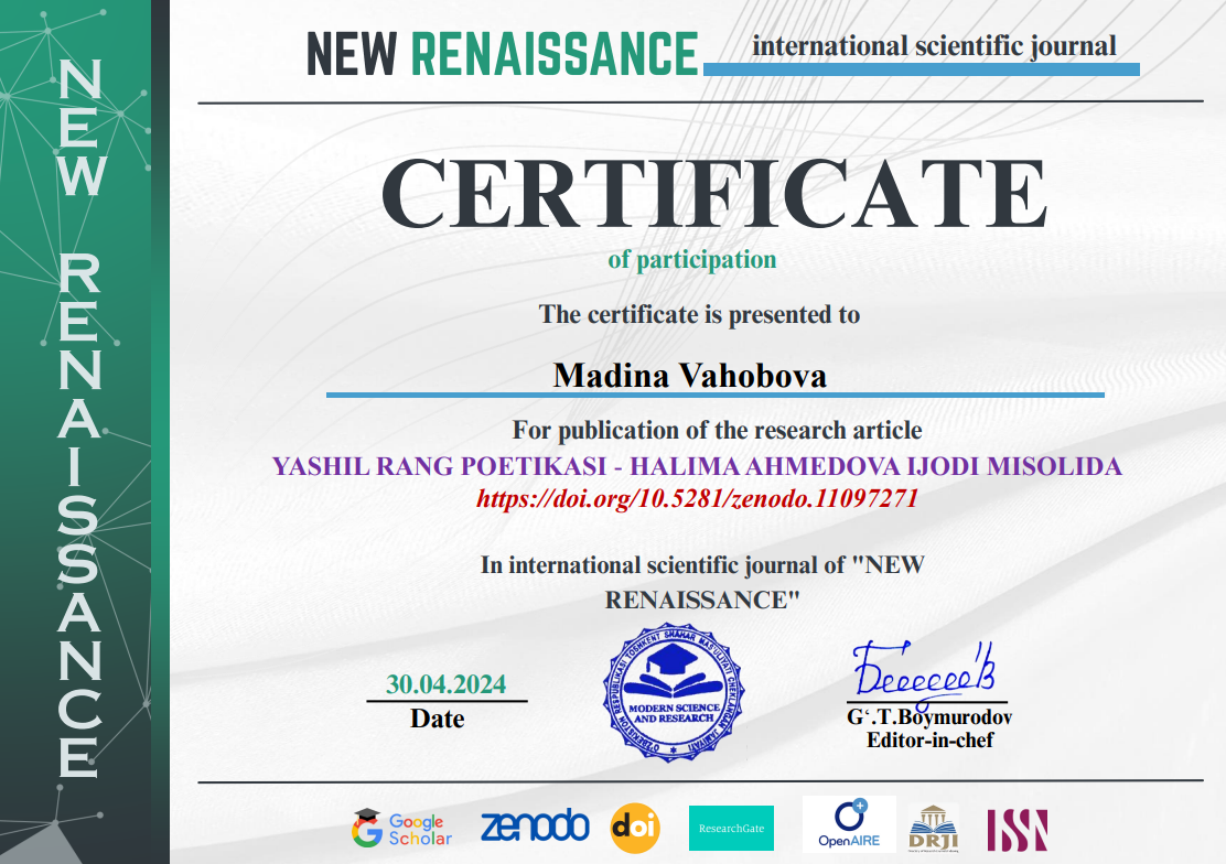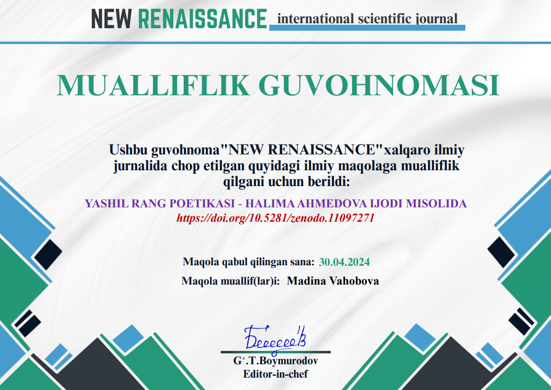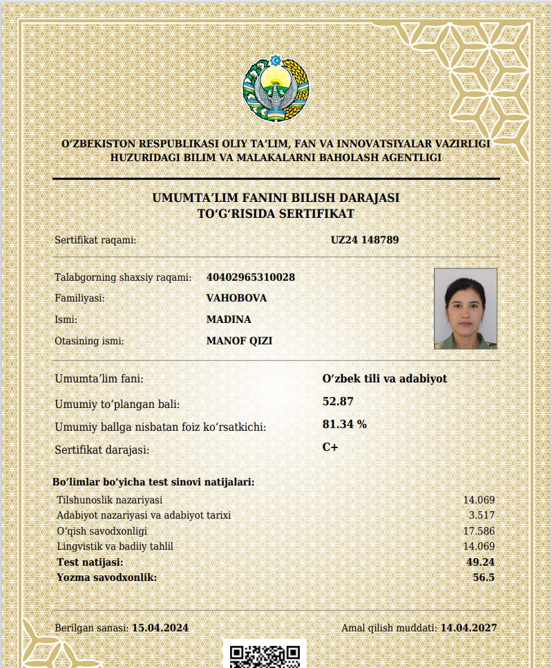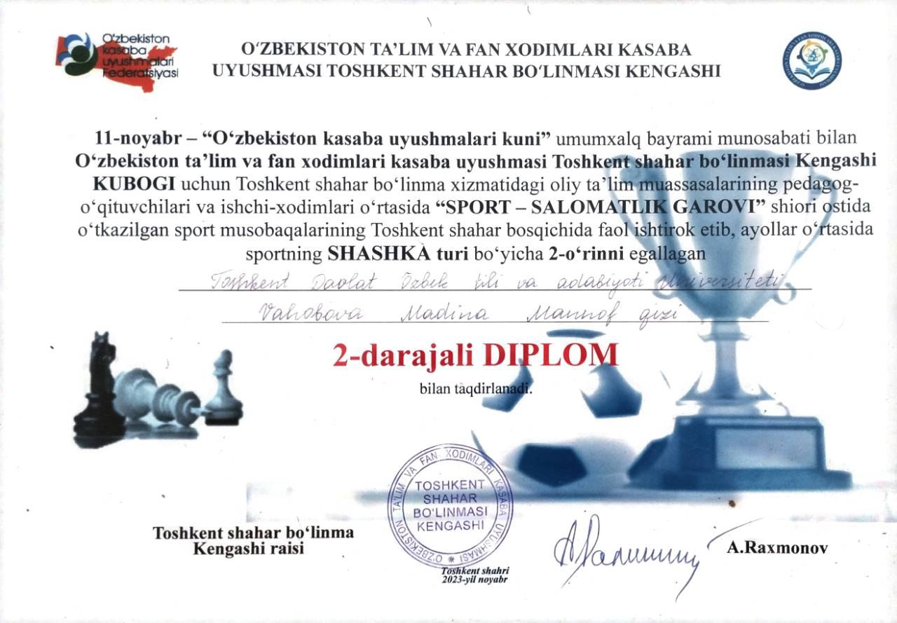 Bosh mutaxassis.Taʼlim sifatini nazorat qilish boʼlimi. Аlisher Navoiy nomidagi Toshkent davlat oʼzbek tili va adabiyoti universiteti