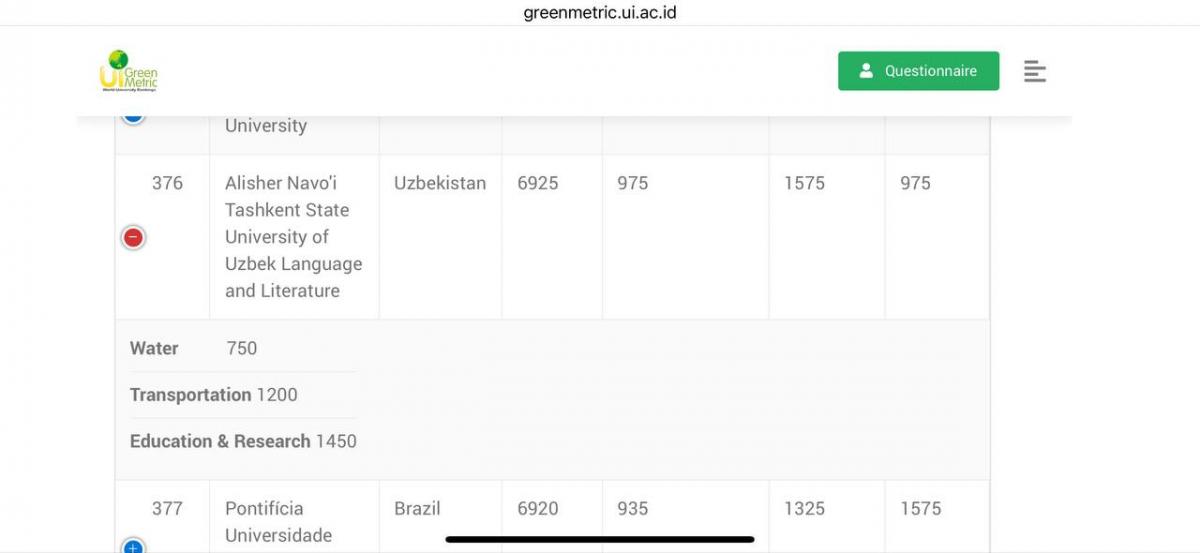 Dunyoga mashhur "UI GreenMetric" jahon universitetlari reytingining 2023-yil natijalari e'lon qilindi. Oʻtgan yilda universitetimiz ushbu reytingda birinchi marta ishtirok etib, 507-oʻrinni egallagan boʻlsa, bu yil 376-oʻrinni qayd etdi. Ushbu natija universitetimizda amalga oshirilgan ishlarning strategik jihatdan puxta oʻylanganligi va biz mana shunday shijoat bilan ishlashda davom etishimizni anglatadi.