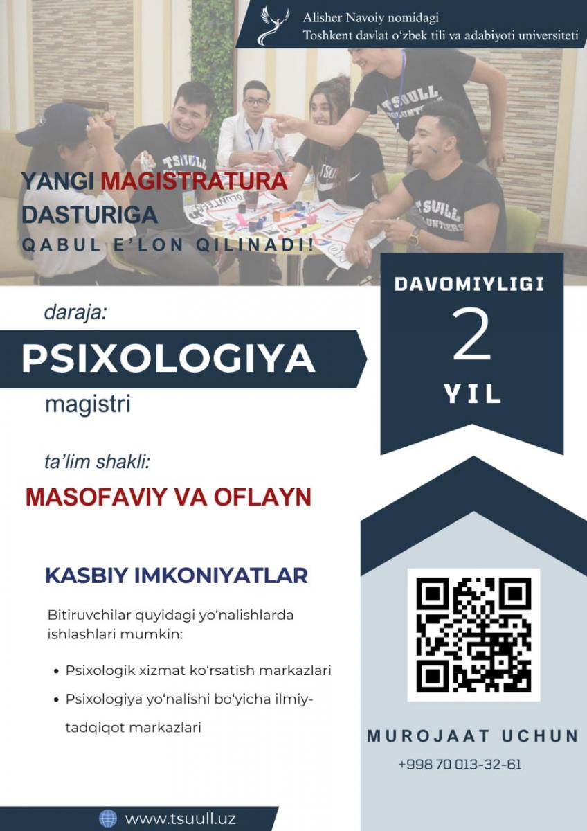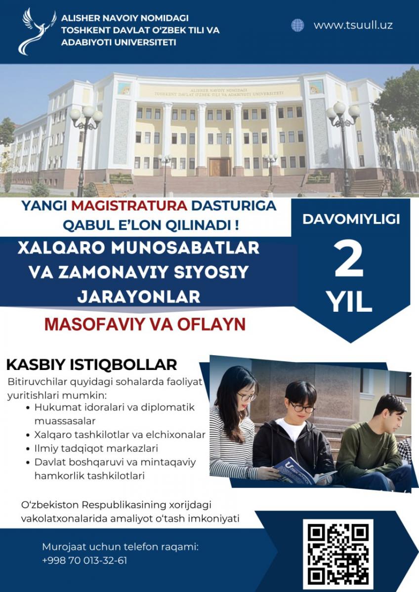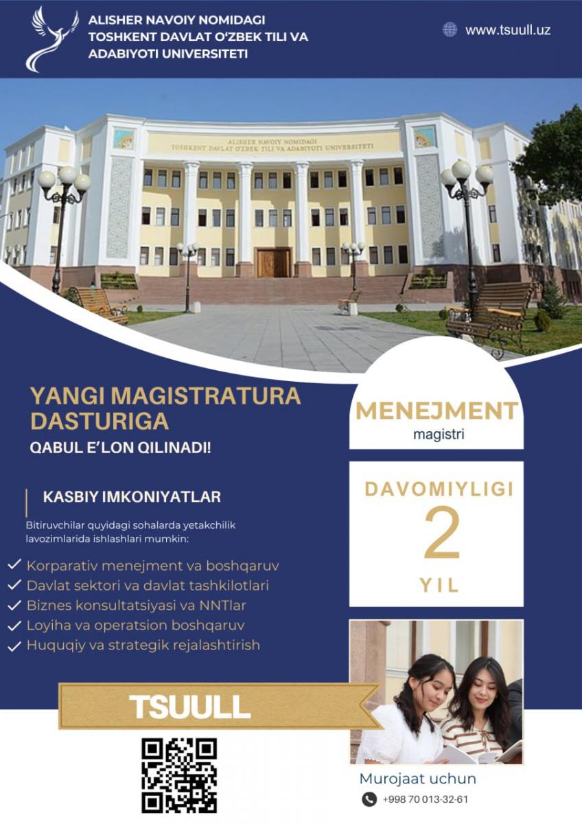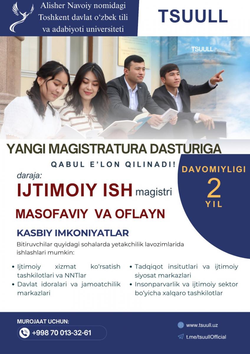 Alisher Navoiy nomidagi Toshkent davlat oʻzbek tili va adabiyoti universiteti magistratura bosqichiga quyidagi yo‘nalishlar boʻyicha masofaviy va kunduzgi ta’lim shakllarida qabul e’lon qiladi: