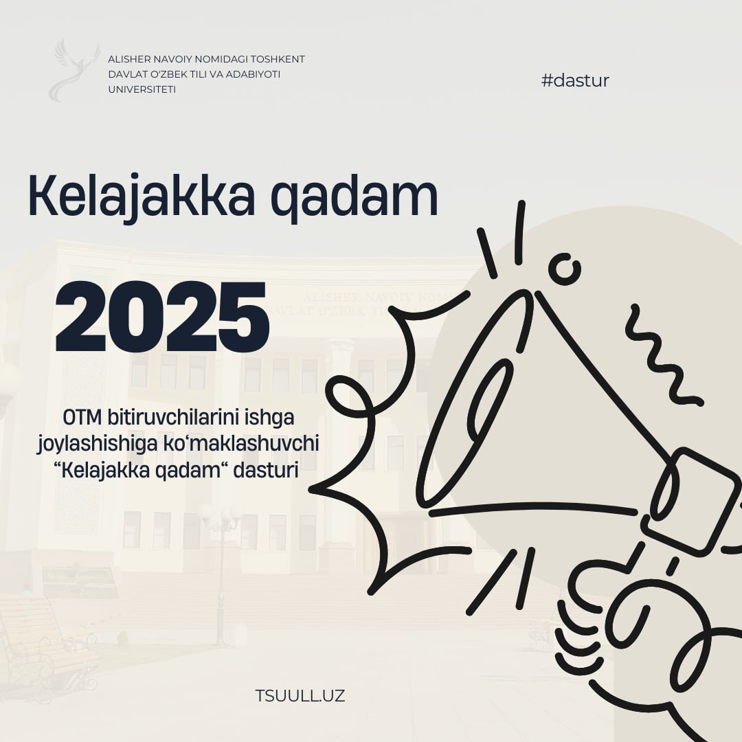 20 Oct 2025 24.03.2025 OTM bitiruvchilarini ishga joylashishiga ko‘maklashuvchi “Kelajakka qadam” dasturi amalga oshiriladi Batafsil
