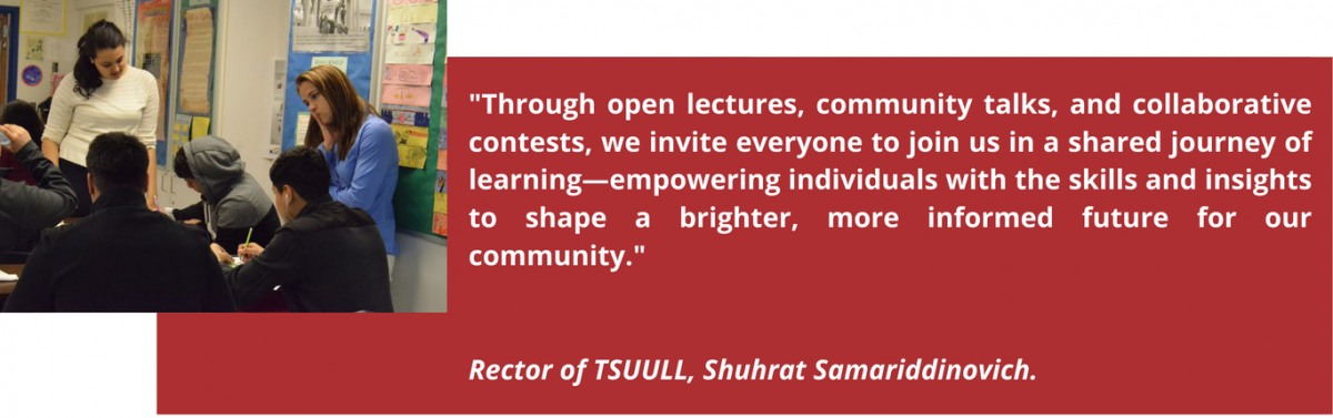 University Youth Affairs department and university professors organized "Spirituality Caravan" project which aims at providing books and educational materials for displaced people in Yakkasarayy district. Refugee children and displaced people are offered free access "Open Lectures" which are held in our university. In 2021, the education Working Group consisting university professors and teachers and Students' Union were merged in Yakkasaray district to meet with vulnerable people who do not have access to education. Furthermore, for partners to coordinate activities, share best practices and ensure that opportunities provided in TSUULL are based on evidence and meeting the needs of the beneficiary population on basic, higher educational levels as we as exploring cross sector coordination with livelihood sector.